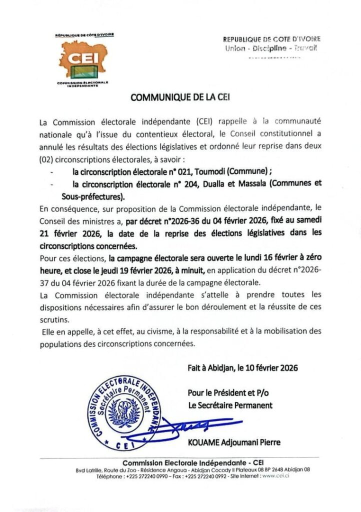 Les habitants des circonscriptions de Toumodi et de Dualla-Massala seront de nouveau appelés aux urnes le samedi 21 février 2026 pour élire leurs députés.