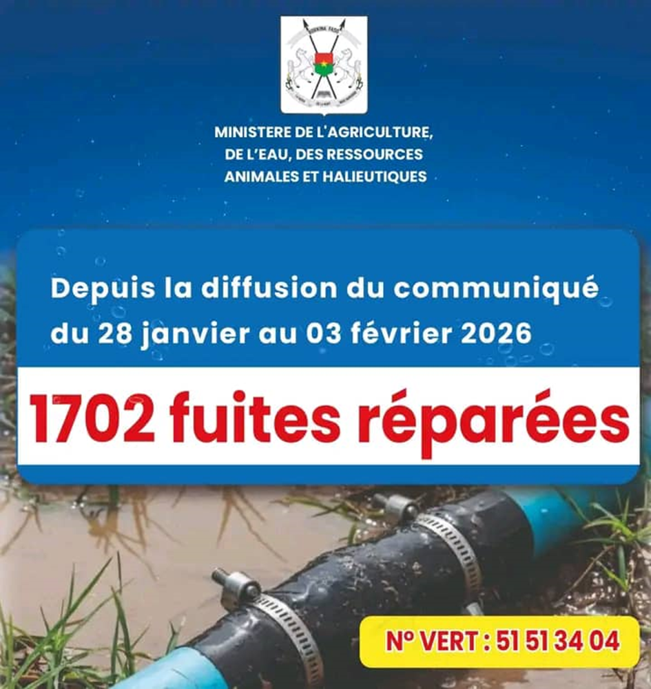 À la suite du communiqué du Ministère de l’Agriculture, de l’Eau, des Ressources animales et halieutiques, invitant les populations à signaler les fuites d’eau non prises en charge dans un délai de trois heures après alerte au numéro vert de l’office nationale de l’eau et de l’assainissement (ONEA), des résultats significatifs ont été enregistrés sur le terrain.