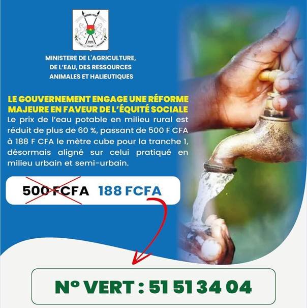Portée par la vision du Président du Faso, le Capitaine IBRAHIM TRAORÉ, cette réforme traduit une volonté affirmée de renforcer la justice sociale. L’objectif est de garantir à tous un accès équitable à un service essentiel, tout en améliorant la qualité de l’eau distribuée à l’échelle nationale.