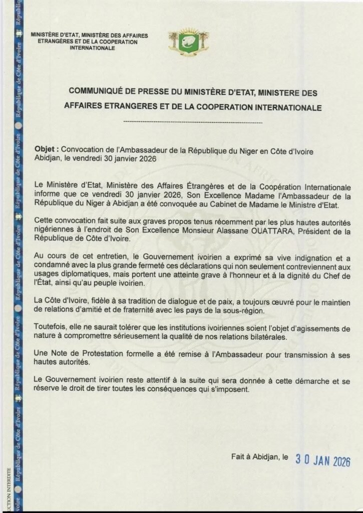 Les relations entre la Côte d’Ivoire et le Niger connaissent un nouvel épisode de crispation. Ce vendredi 30 janvier 2026, les autorités ivoiriennes ont convoqué l’ambassadrice du Niger à Abidjan, à la suite de déclarations du président nigérien ABDOURAHAMANE TIANI visant directement le chef de l’État ivoirien, ALASSANE OUATTARA.